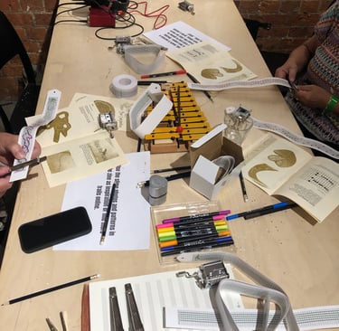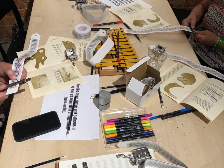 Get inspired by the graphic scores of nature's slimy slug and snail trails. Trace or draw your own patterns onto strips of music box paper, punch holes and play and record your own music box compositions.